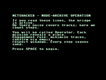 If you love the C64, you’ll love going back to where it all began: prompt, floppy disks, and cunning. Netshacker is an experience built for demanding retrogamers — an authentic terminal, believable logic, no shortcuts.